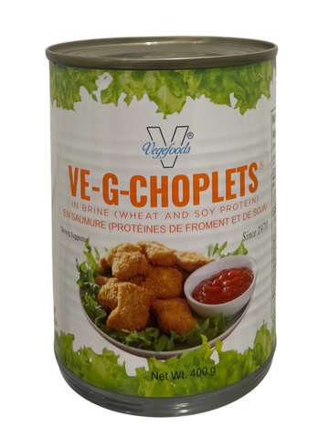 Ve-g-choplets are juicy and delicious vegetarian protein fillet packed in savory broth and seasoned with the right herbs to give it chicken flavour, delicious used in entrees and sandwiches. Dip in bread crumbs or beaten egg and fry in deep fat until golden brown for a quick, special treat.